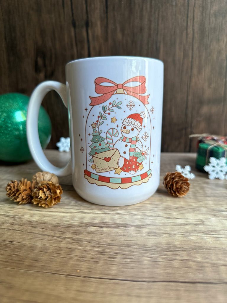 'Tis the season for cute Christmas gifts and this snow globe mug is perfect for anyone who loves Christmas Cheer in a cup! The design features the cutest snowman with a carrot nose, with their letter to Santa, Christmas tree, Christmas stocking, surrounded by snowflakes, stars, holly and all the joys of the Christmas season!