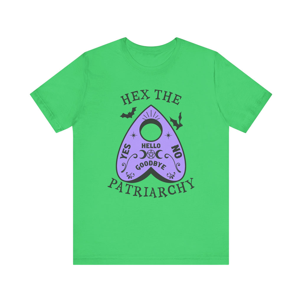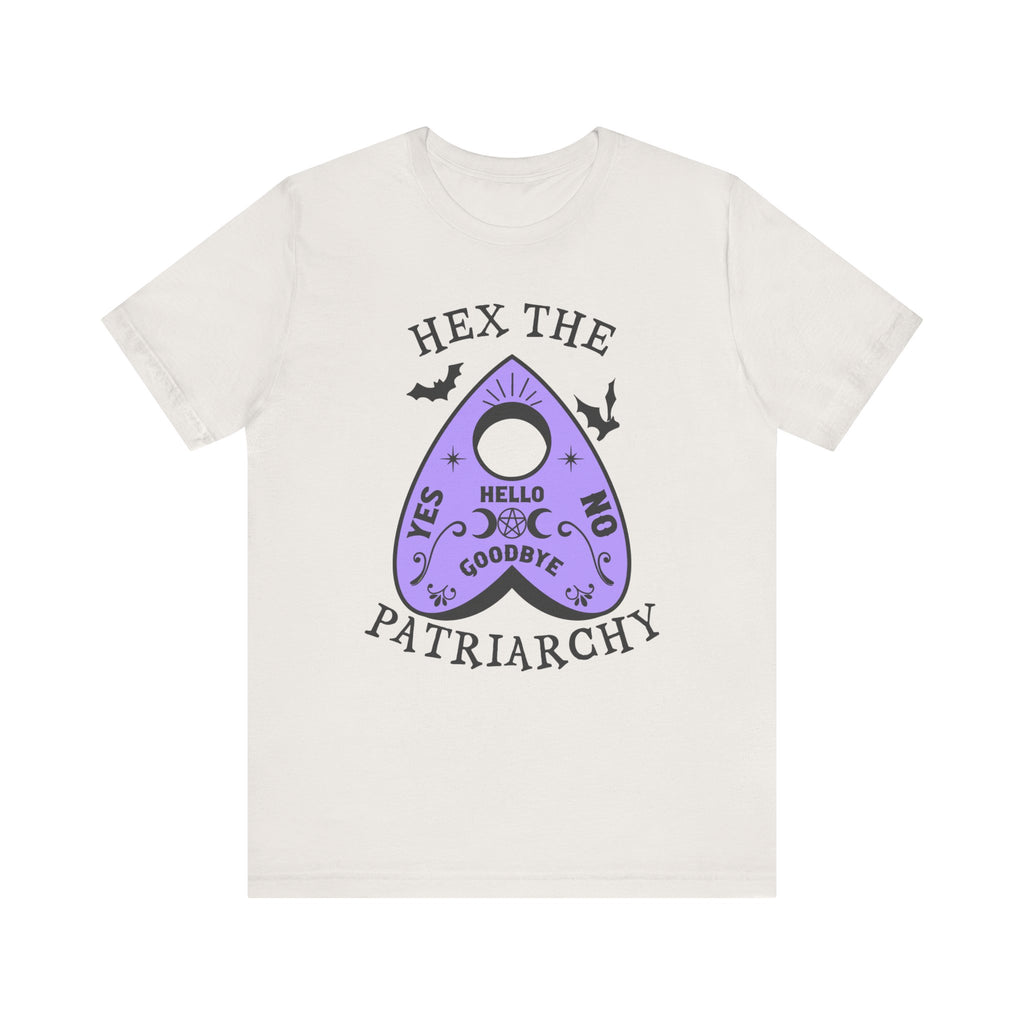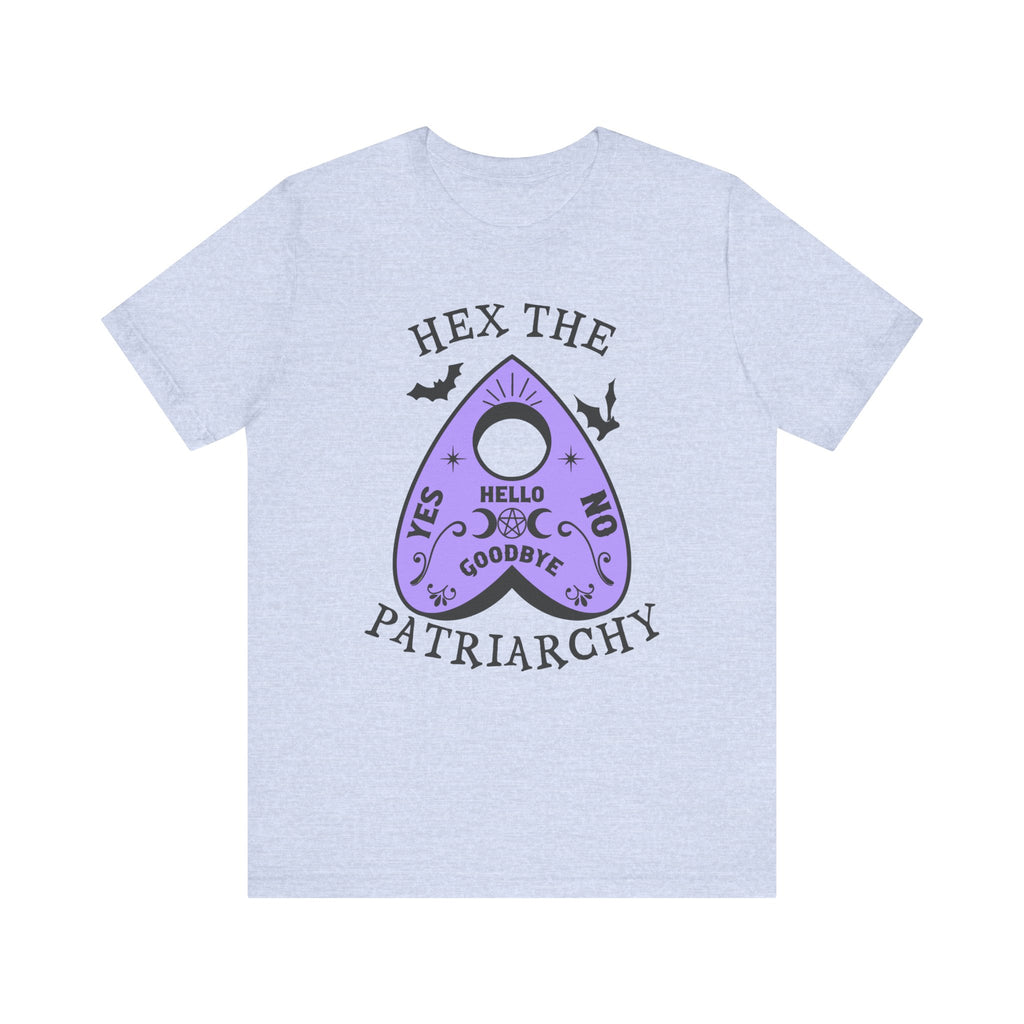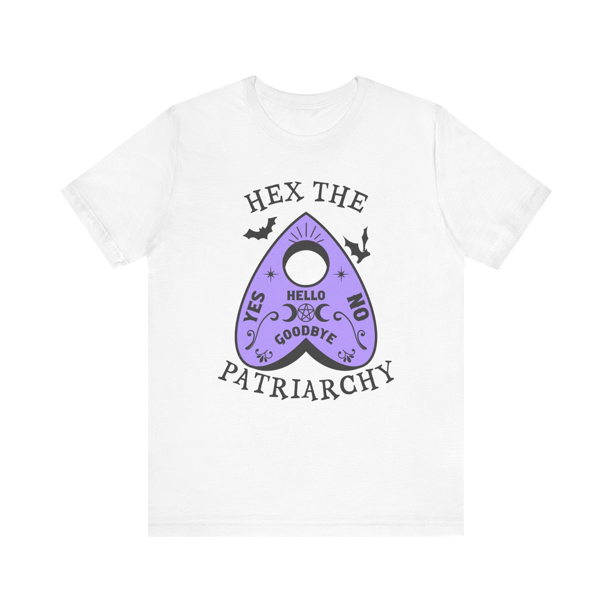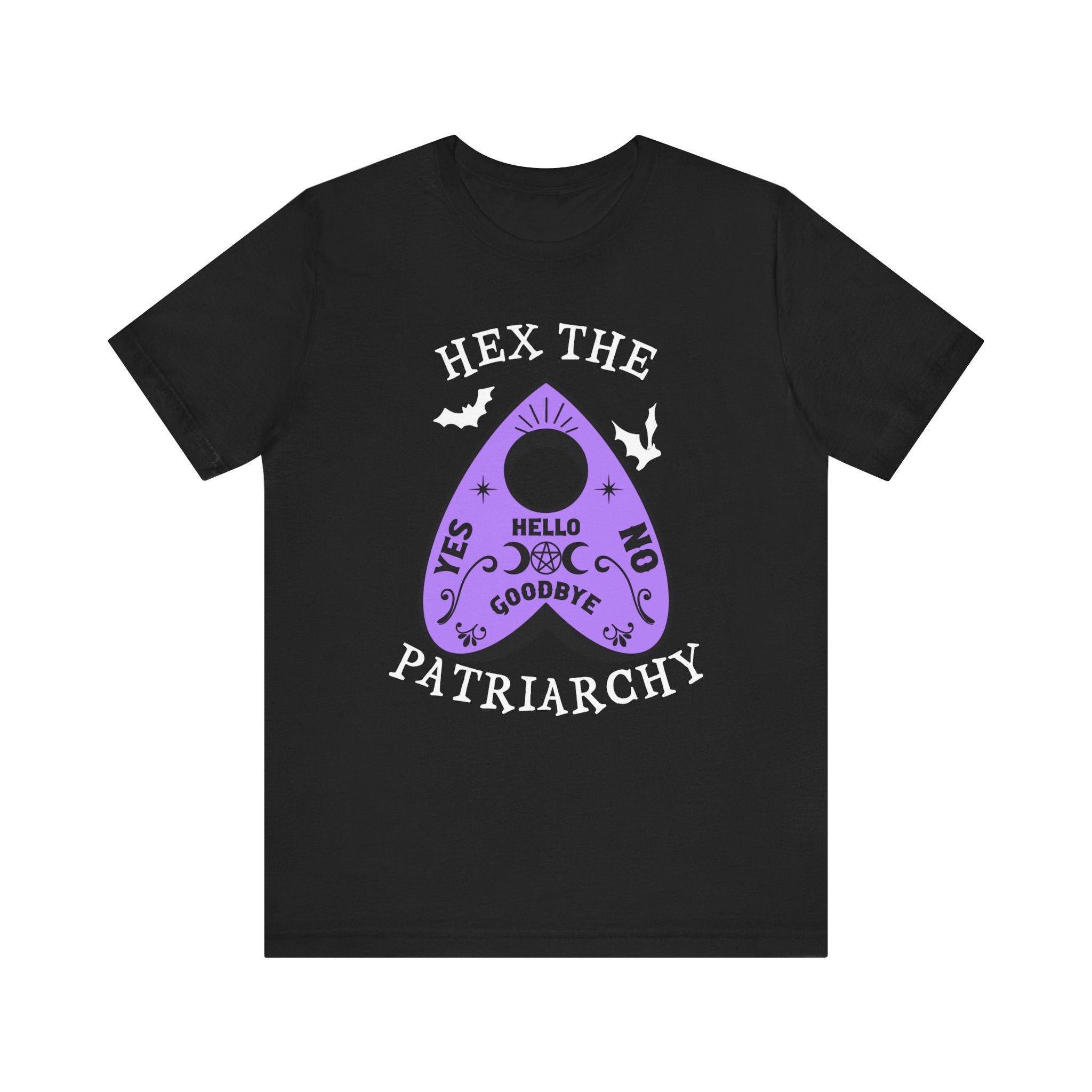 Empower your inner witch with this witchy planchette tee that screams 'Hex The Patriarchy'. Perfect for feminists and those who challenge outdated systems. Ideal for anyone looking to make a statement or show solidarity with their coven. Great for wearing during protests, your local coven meeting, game night, bonfires, apple picking, or any day you damn well please.