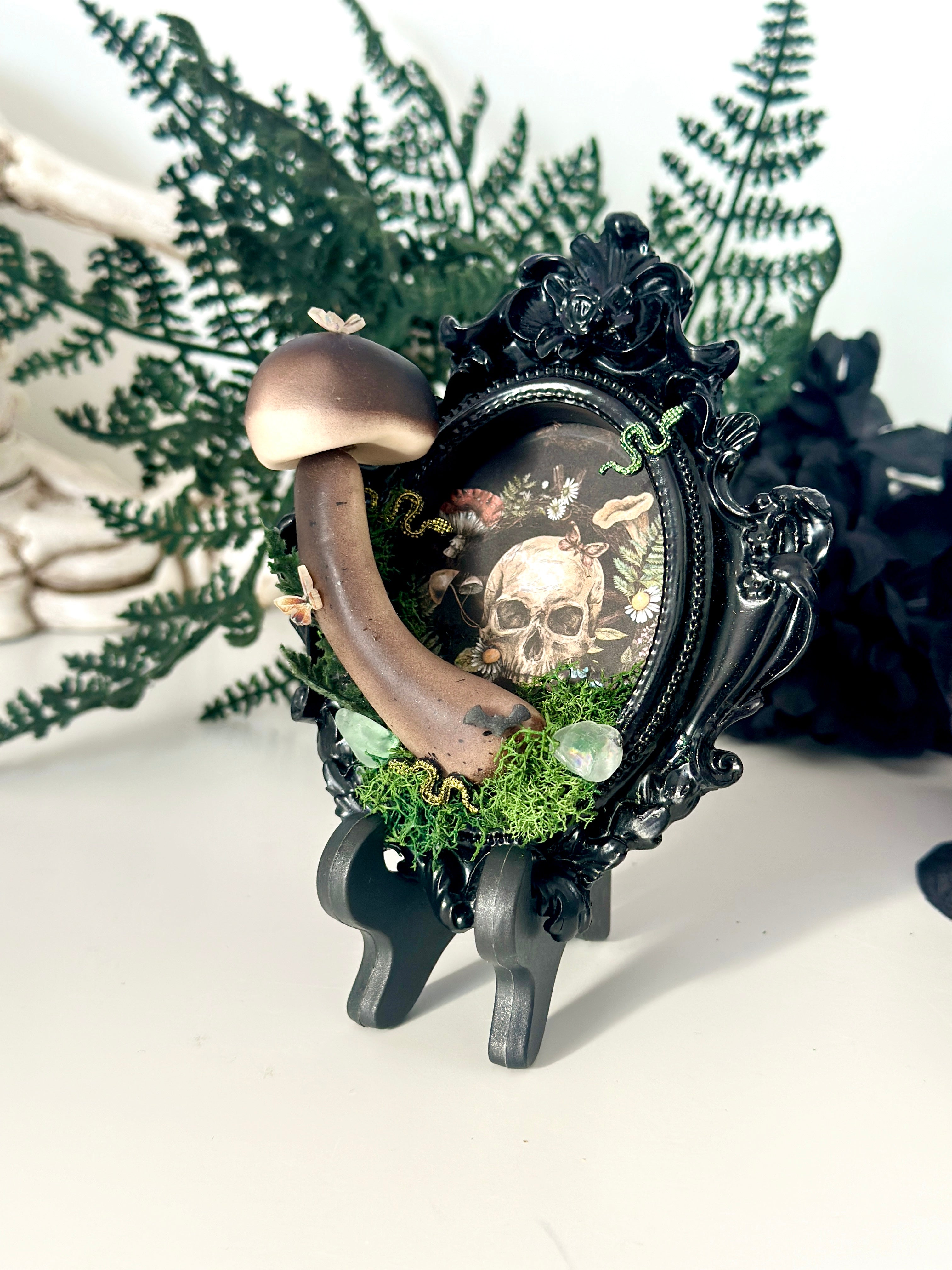 Set inside an ornate black frame, this tiny world features lifelike mushrooms, preserved moss, a skull illustration, crystal accents, and a delicate serpent winding through the scene. It’s a hauntingly beautiful addition to any altar, bookshelf, or oddities collection.