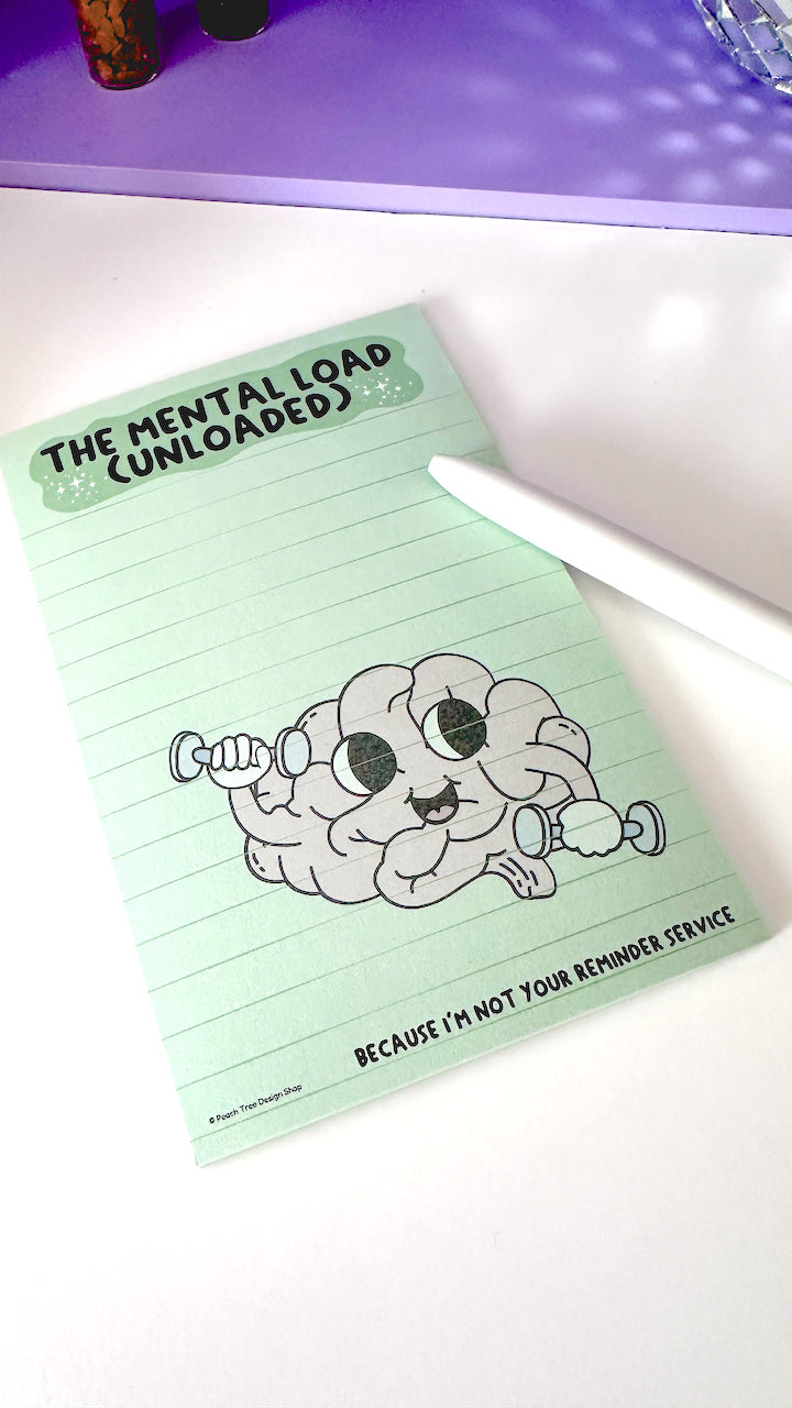 Especially for those in relationships. The Mental Load Unloaded notepad is for the endless to-do list that lives in your head, rent free. The groceries. The appointments. The birthdays. The repairs. The things no one else remembers until you do.